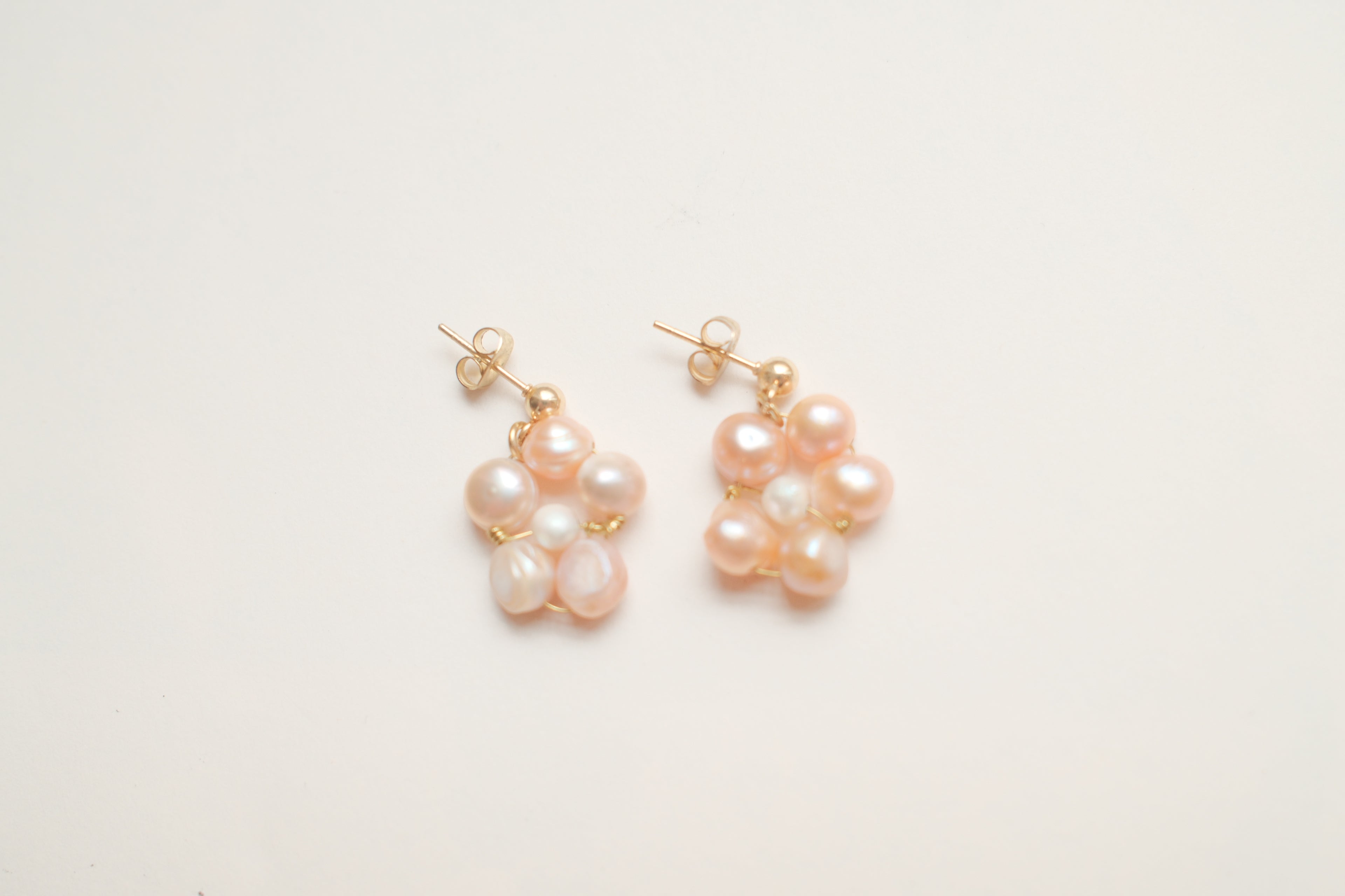 Baby pink freshwater pearls around a white pearl on gold plated wire and gold plated sterling silver studs, perfect for everyday wear or special occasions. Please note, each pair will vary in shape and size due to being made from natural materials. Approx. 2.5cm in length.