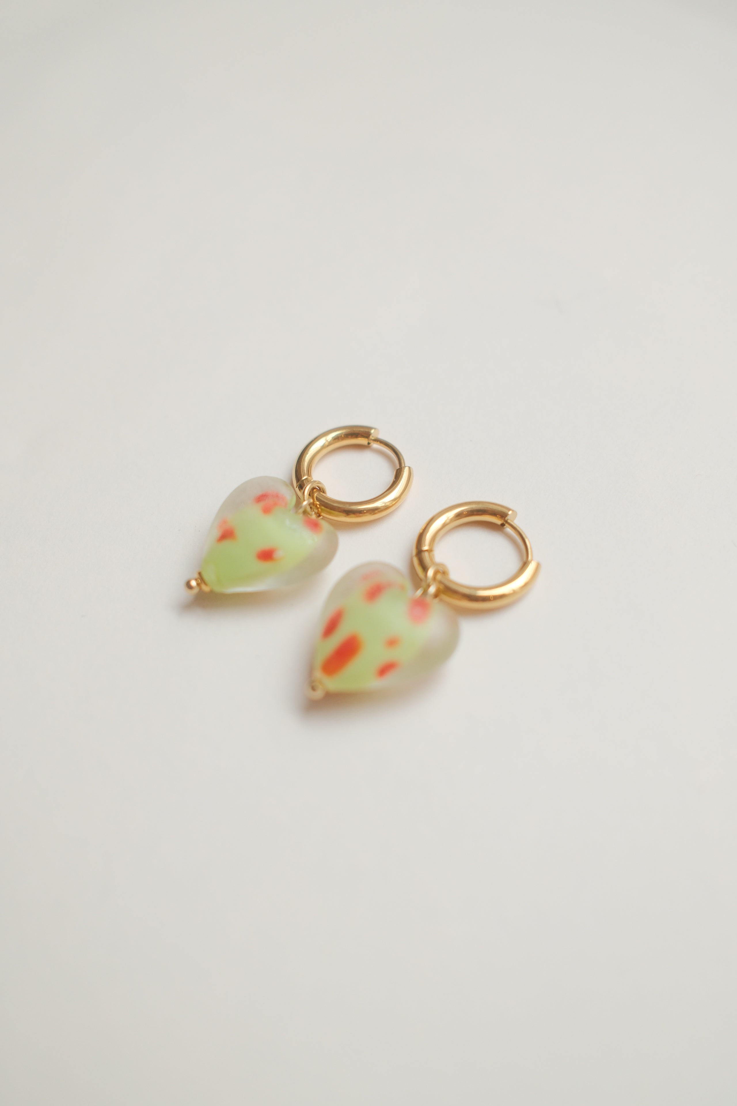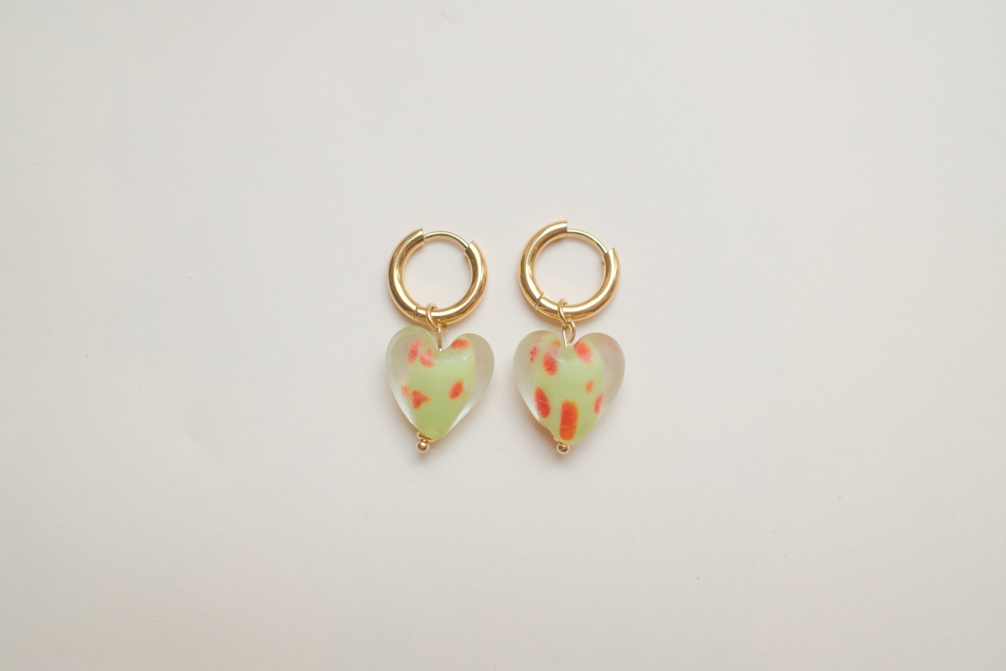 Handmade green glass heart earrings with red polka dots. Attached to stainless steel hoops, these earrings add a colourful touch to any outifit and are perfect for everyday wear or gifting. Please note, each pair may vary slightly due to the handmade nature of the materials. Approx. 3cm in length.