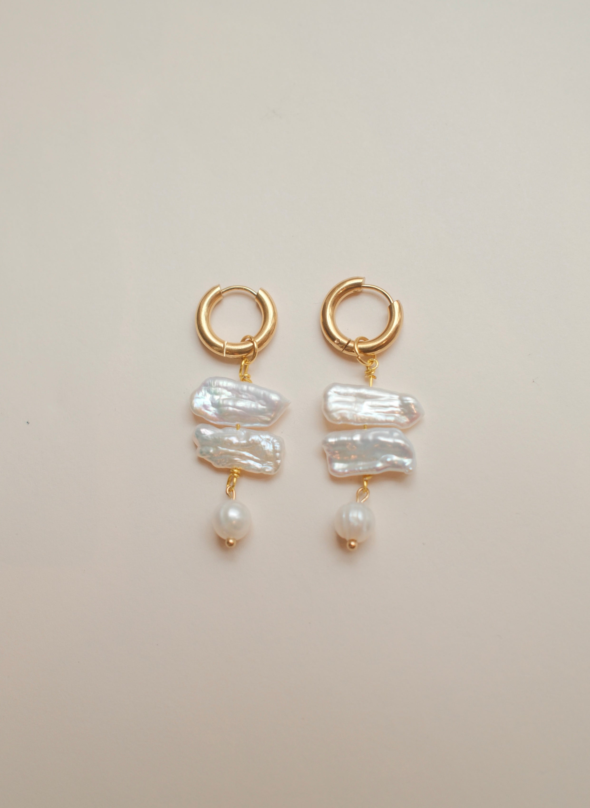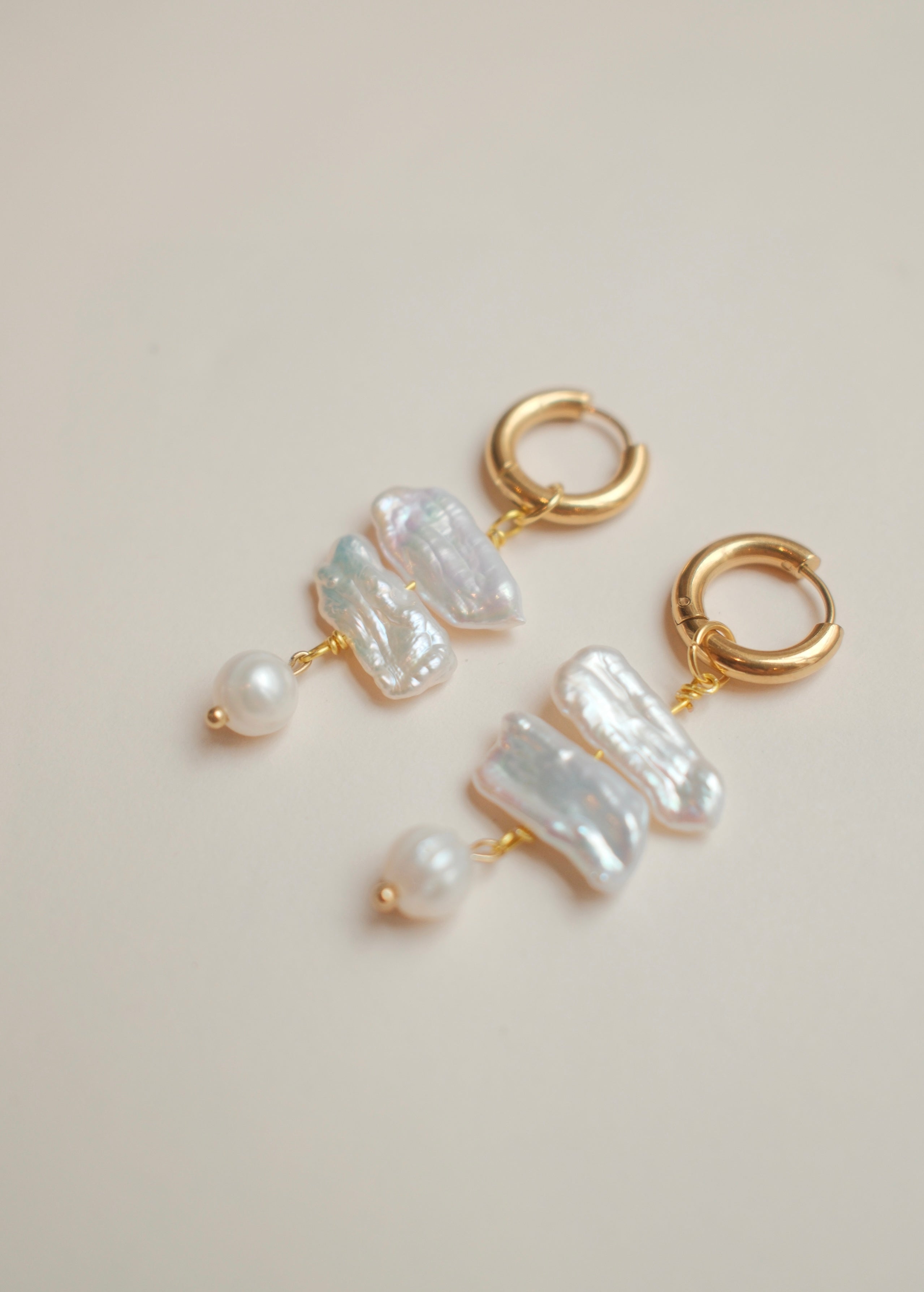 Baroque stick freshwater pearls paired with small round pearls, hanging from stainless steel hoops. These earrings make the perfect elegant everyday-to-evening wear. Please note, each pair will vary in shape and size due to being made from natural materials. Approx. 5cm in length.