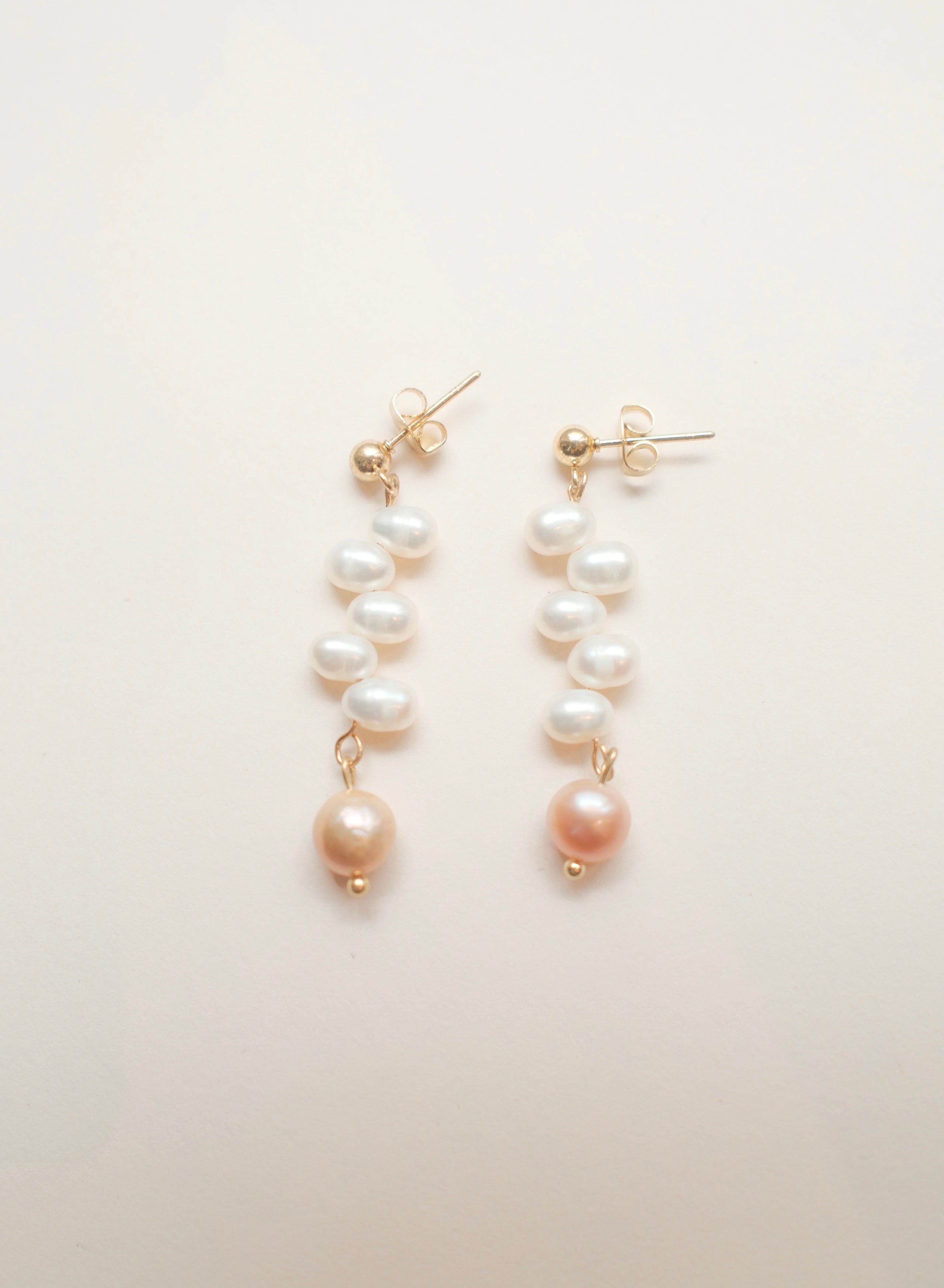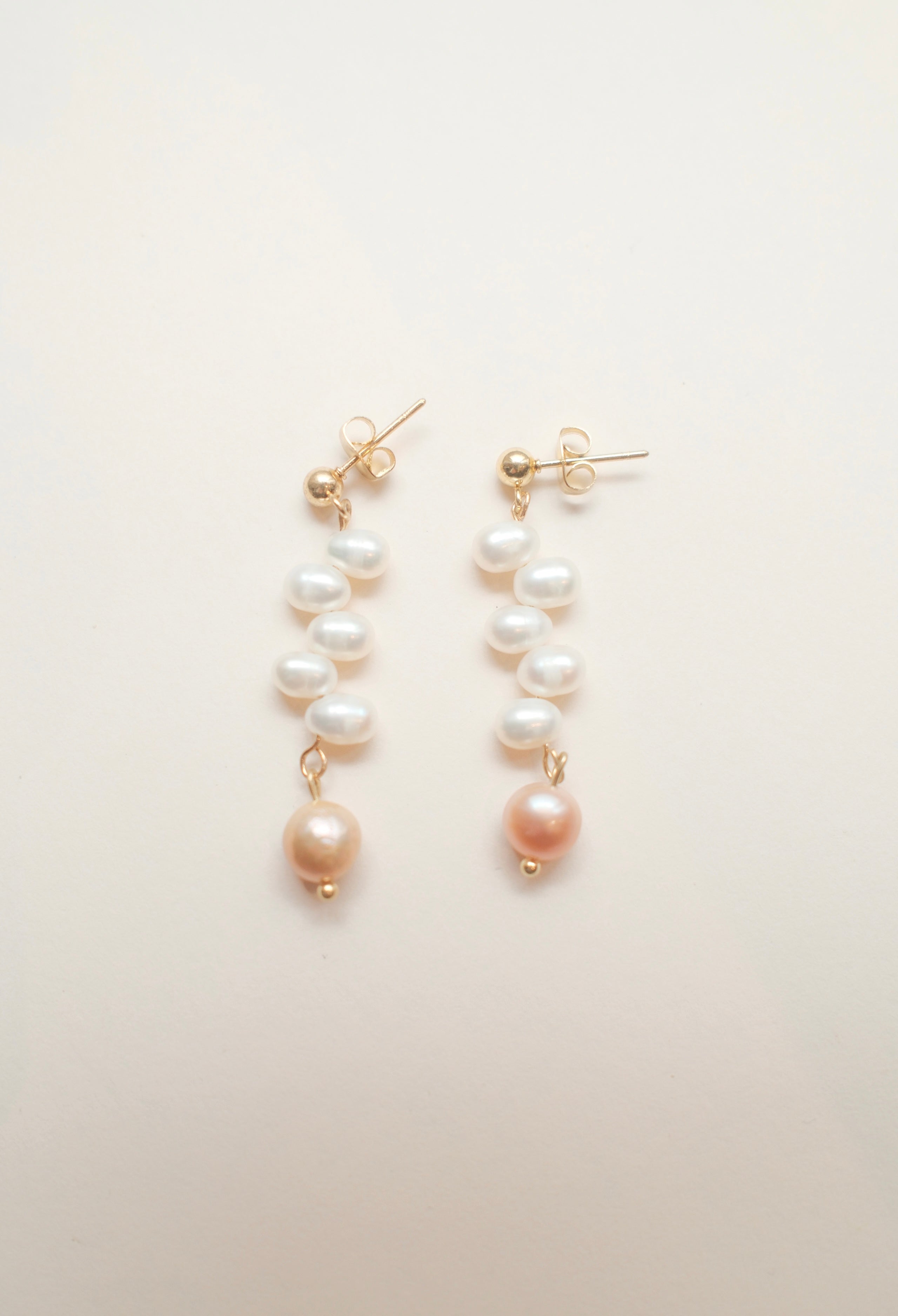 Elegant white freshwater rice pearl earrings with a pink pearl at the bottom, set on sterling silver studs. Please note, each pair will vary in shape and size due to being made from natural materials. Approx. 5cm in length.