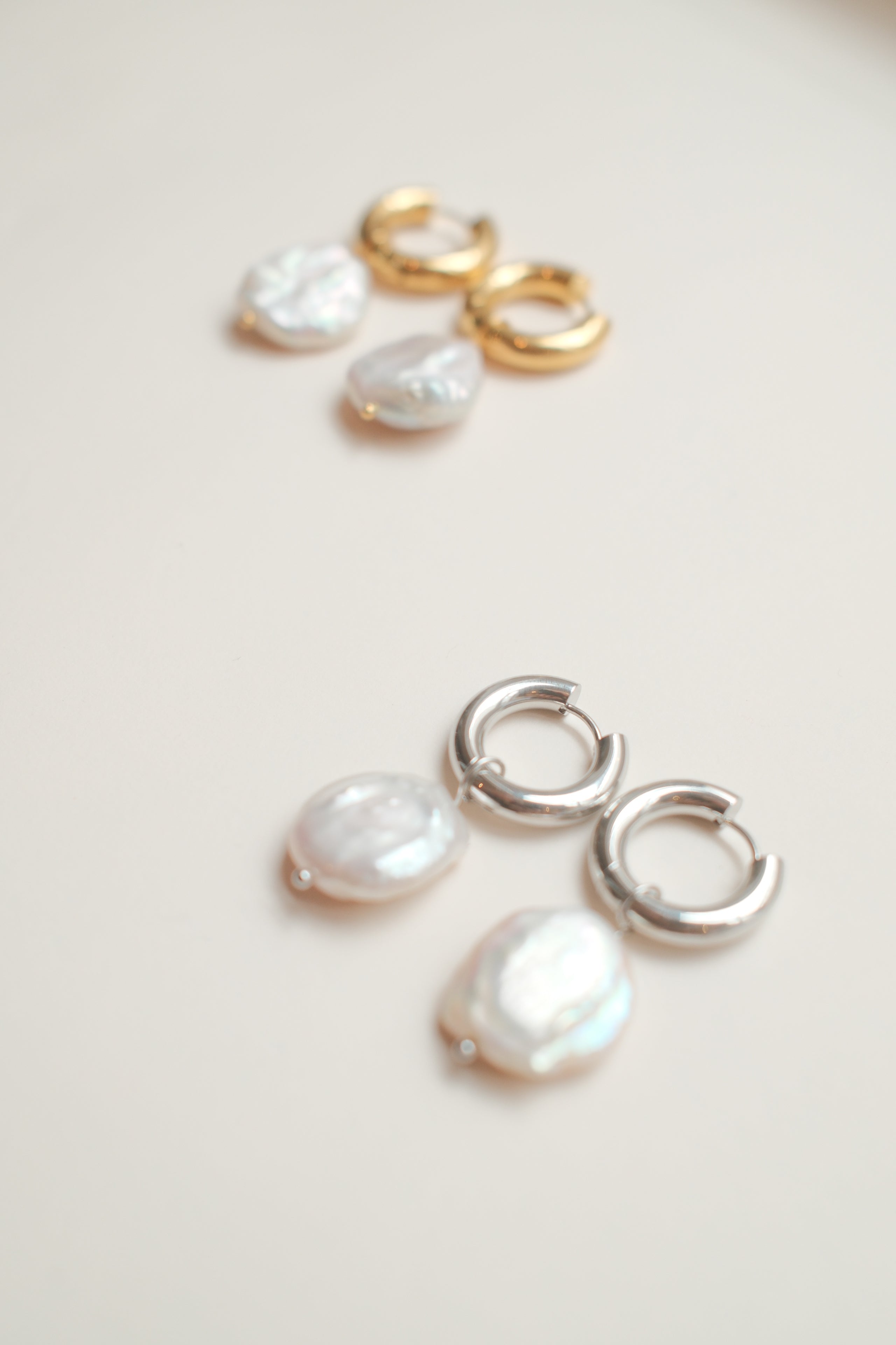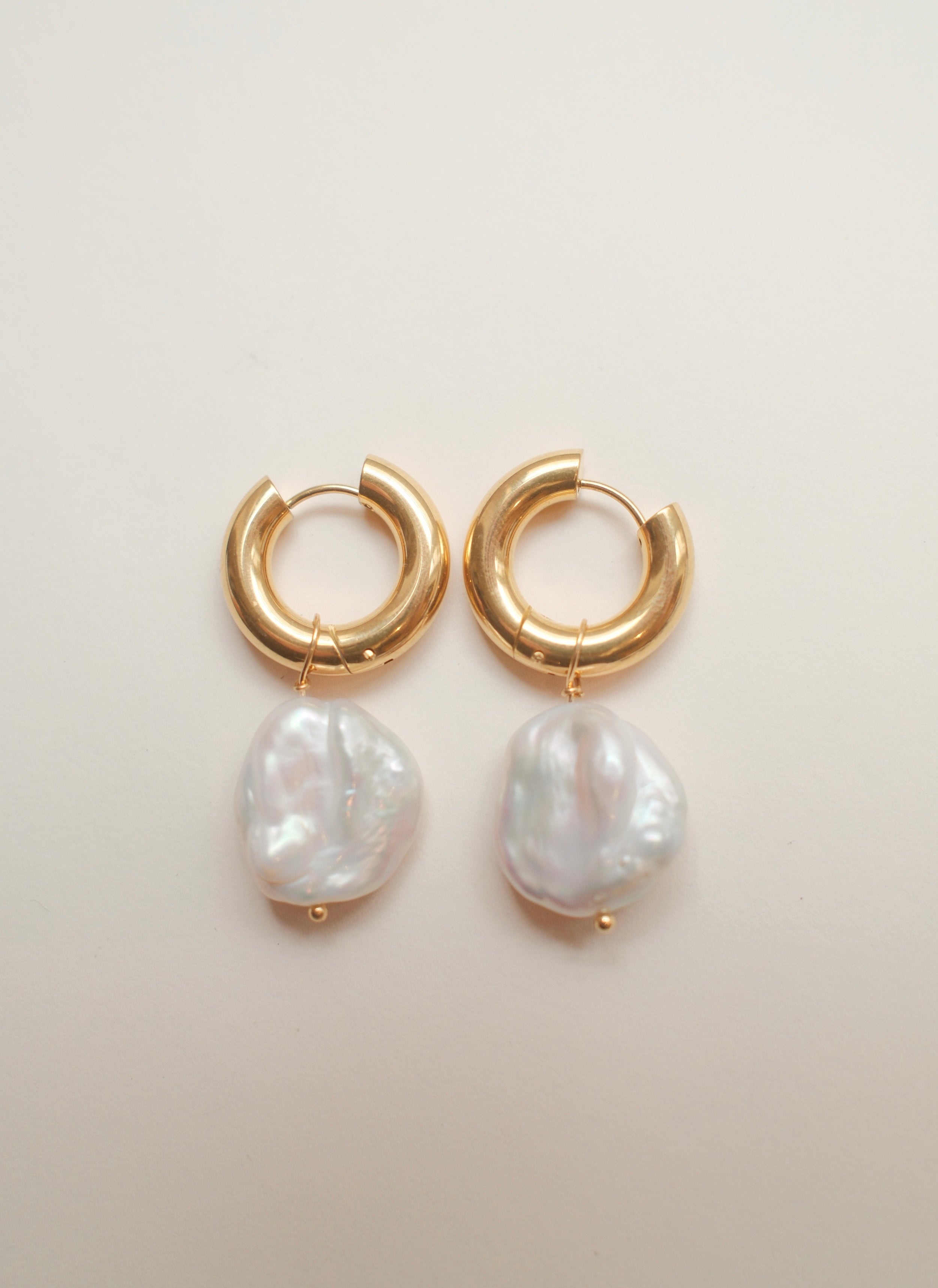 Large baroque freshwater pearls attached to chunky 2cm stainless steel hoops. Each pearl has a unique organic shape and make the perfect elegant but statement earring set. Please note, each pair will vary in shape and size due to being made from natural materials. Approx. 4cm in length