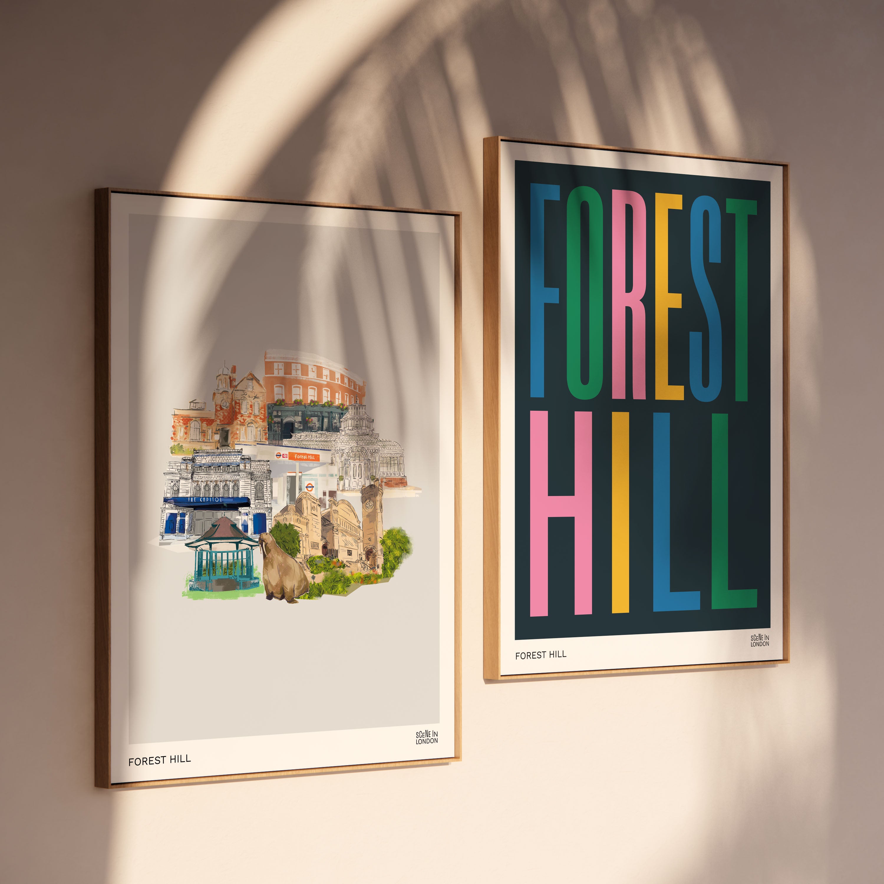 This Forest Hill print is designed and made in London and features popular local landmarks. The Forest Hill illustration includes The Horniman Museum and Gardens, Horniman Conservatory, the Walrus, Capitol Building, Forest Hill Station, Forest Hill Library and local architecture. Dimensions 14.8cm x 21cm