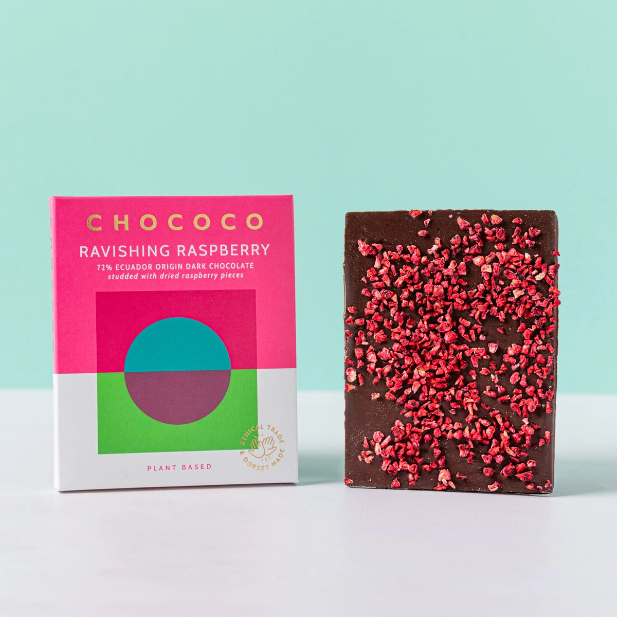 Bright and fruity, this bar of Chococo signature 72% Ecuador dark is studded with tangy dried raspberry pieces to make for a delicious flavour combination.