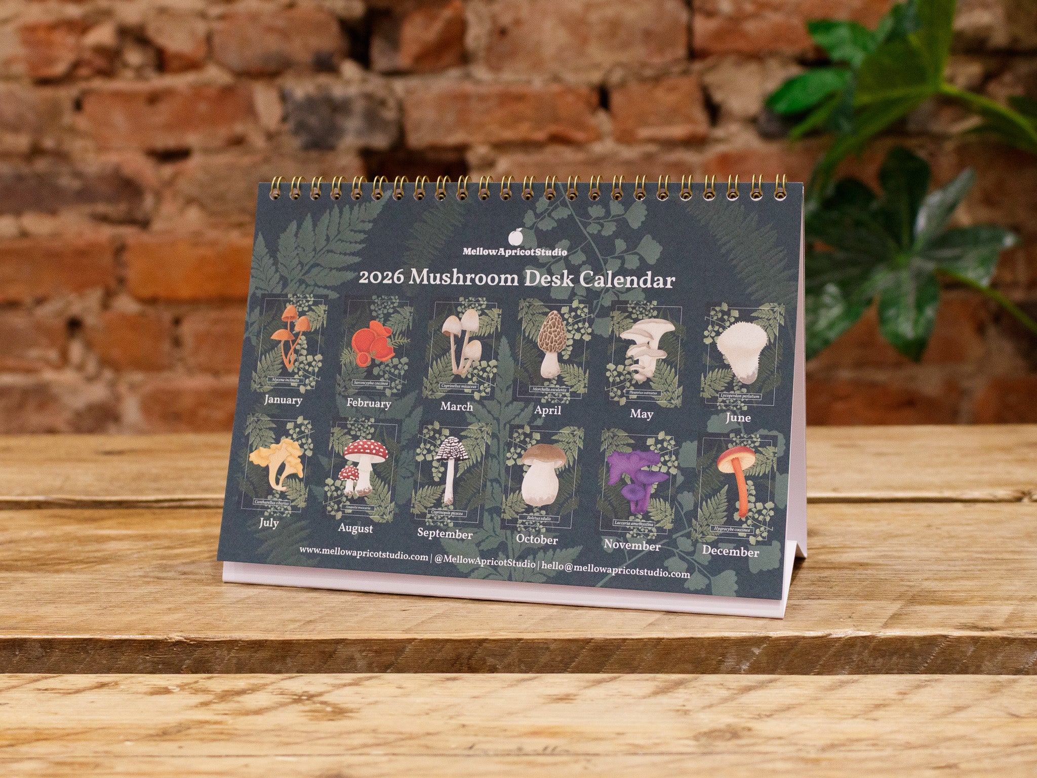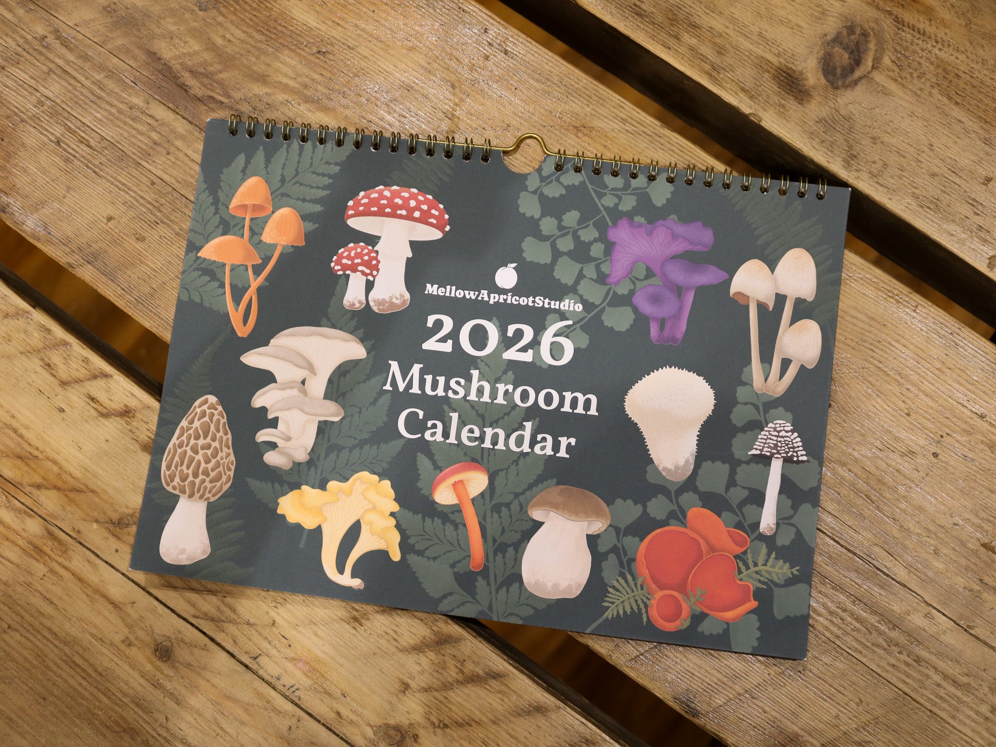 2026 calendar with 12 illustrations of mushrooms which can be found in England. Printed on 170gsm uncoated paper.