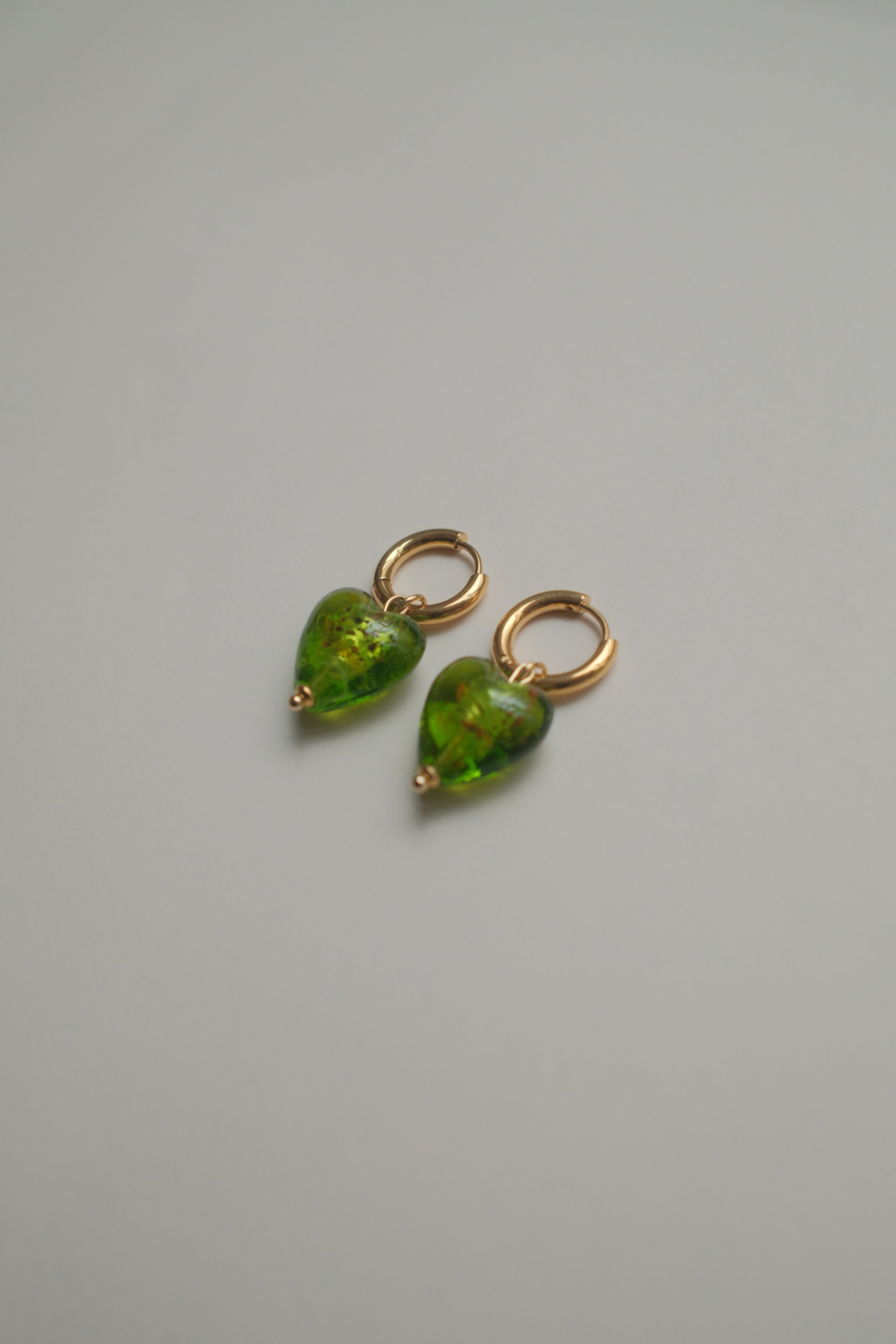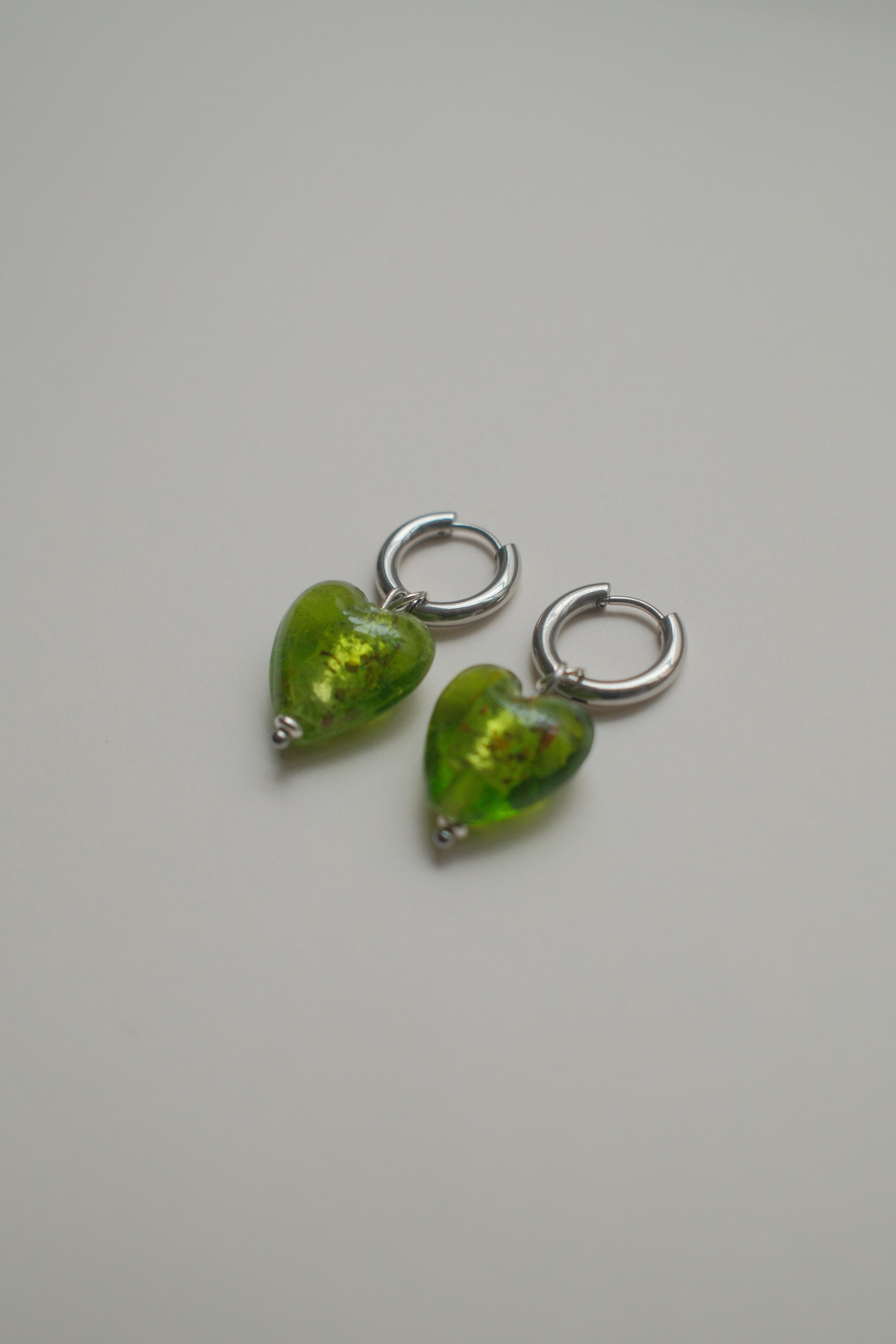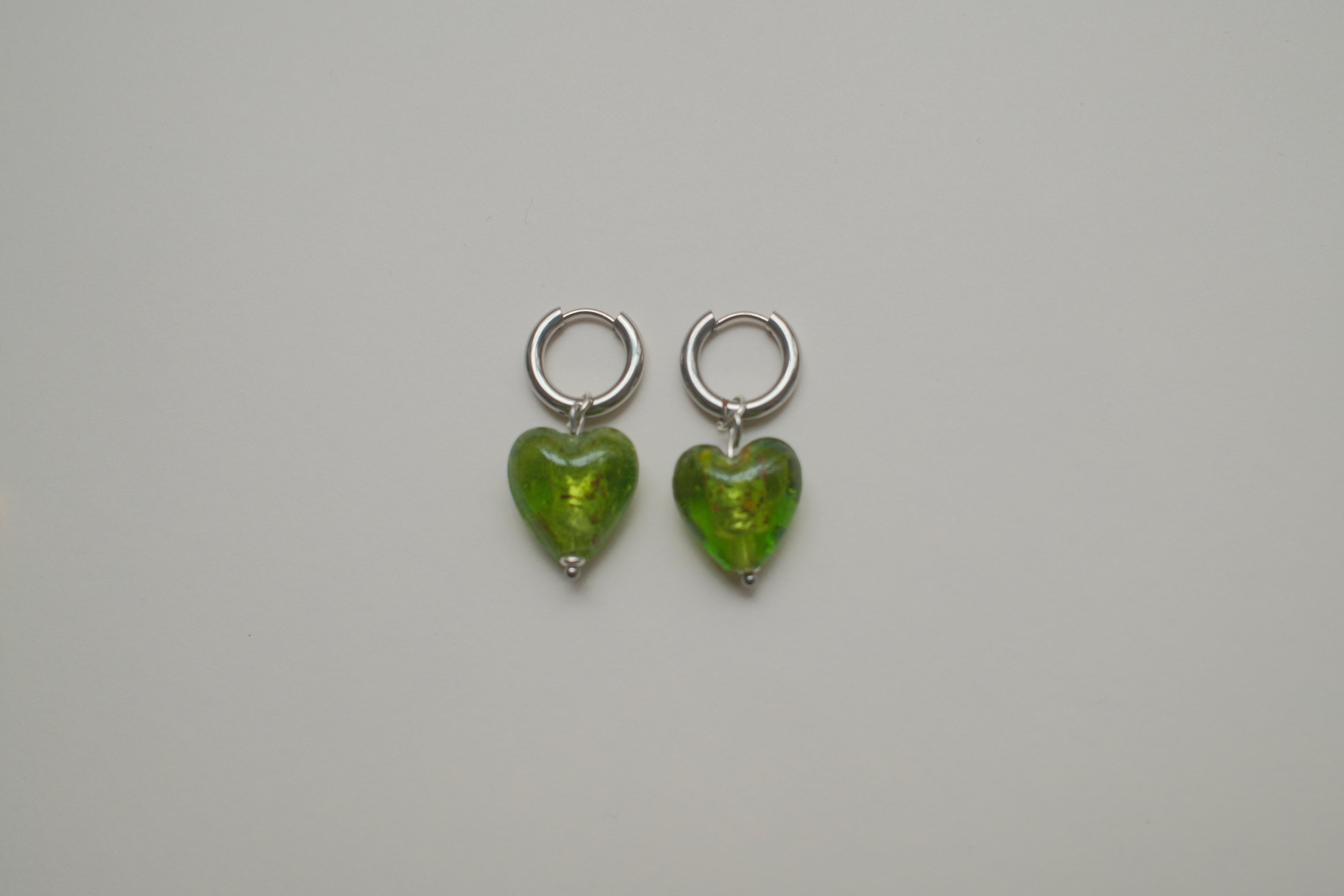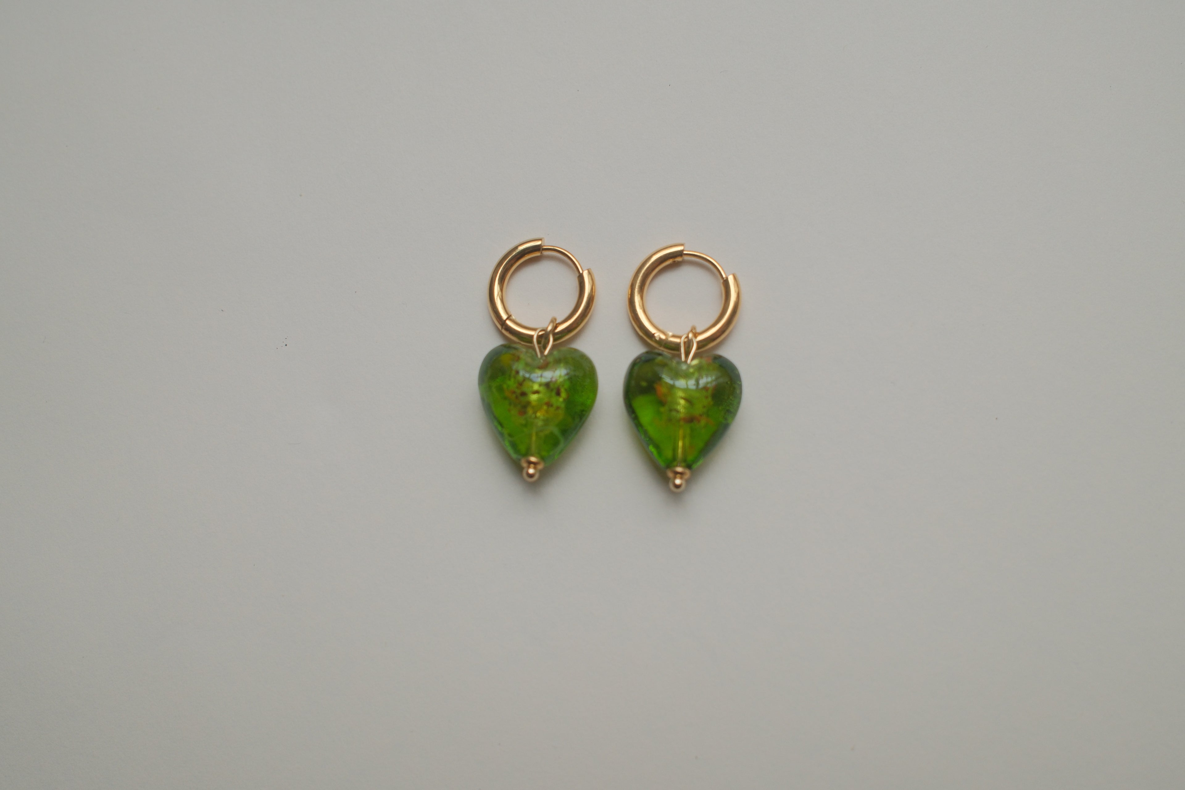 Green glass heart beads with flecks of colour for an iridecent shimmer. Dangling from stainless steel hoops, these earrings are both subtle and a statement, perfect for everyday wear or special occasions. Please note, each pair may vary slightly due to the handmade nature of the materials. Approx. 3.5cm in length.
