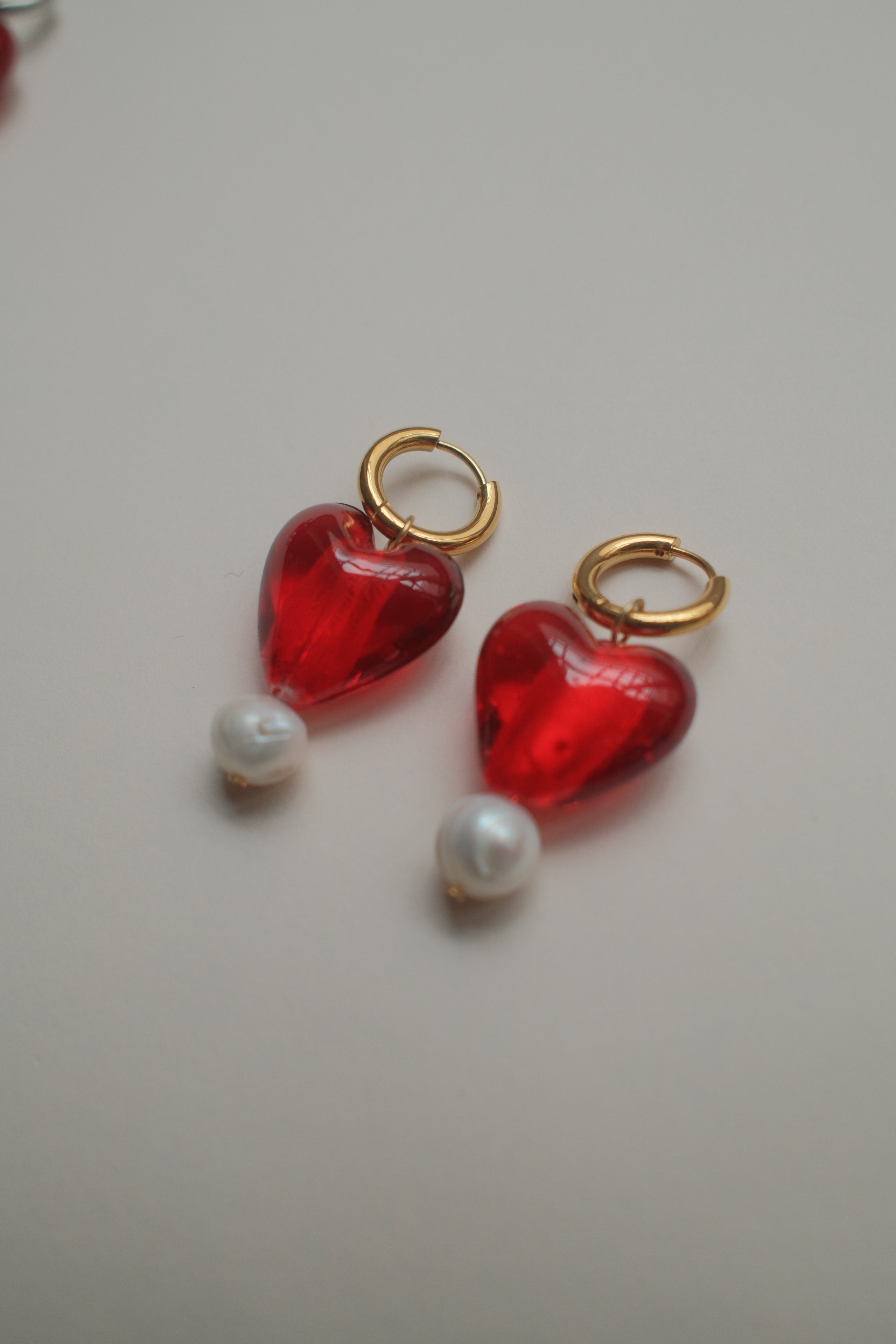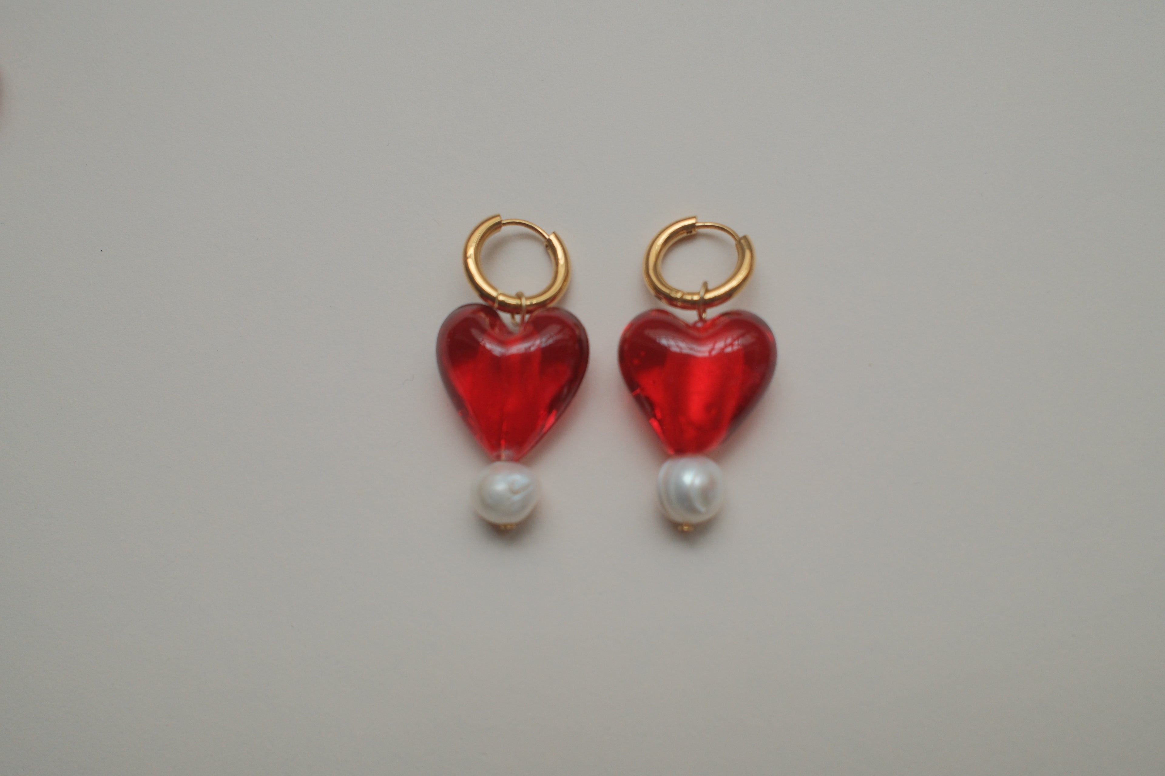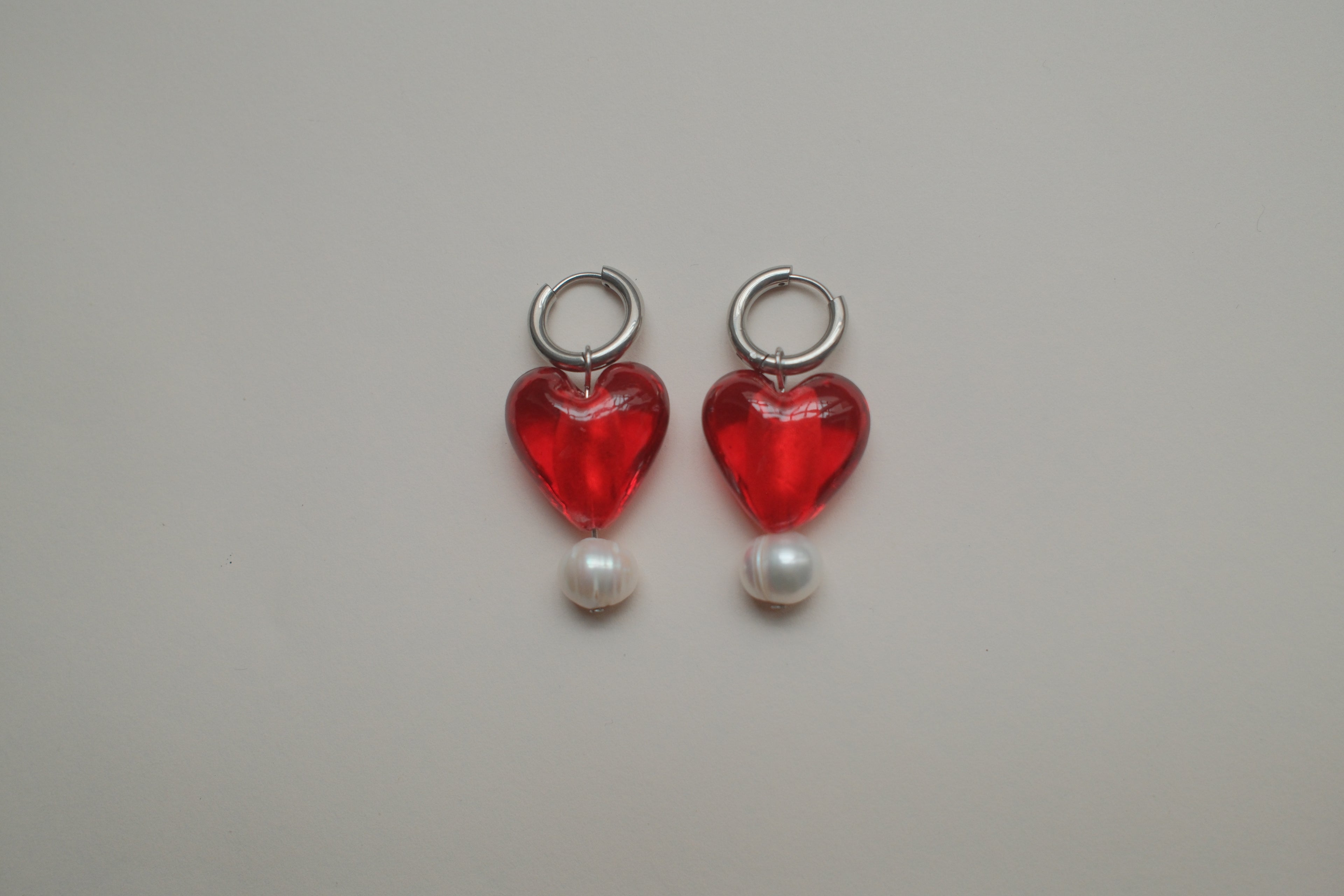 Red glass heart beads with contrasting drop freshwater pearl attached to stainless steel hoops. Please note, each pair may vary slightly due to the handmade and natural materials. Approx. 4cm in length.