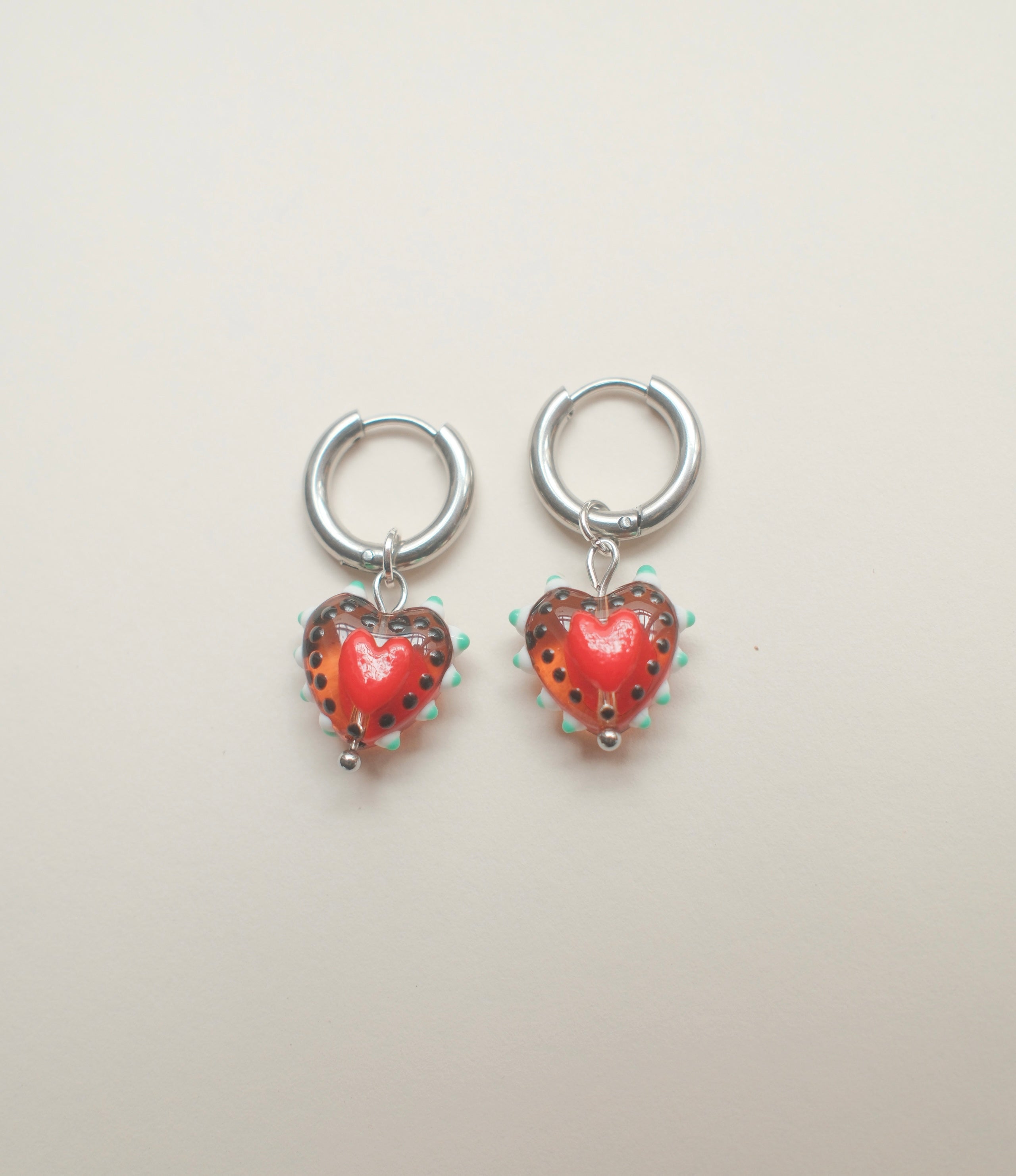 Handmade glass heart beads in vibrant maroon and red, finished with white and green spots. Attached to stainless steel hoops, these earrings bring a playful pop of colour to any outfit. Please note, each pair may vary slightly due to the handmade nature of the materials. Approx. 3cm in length.