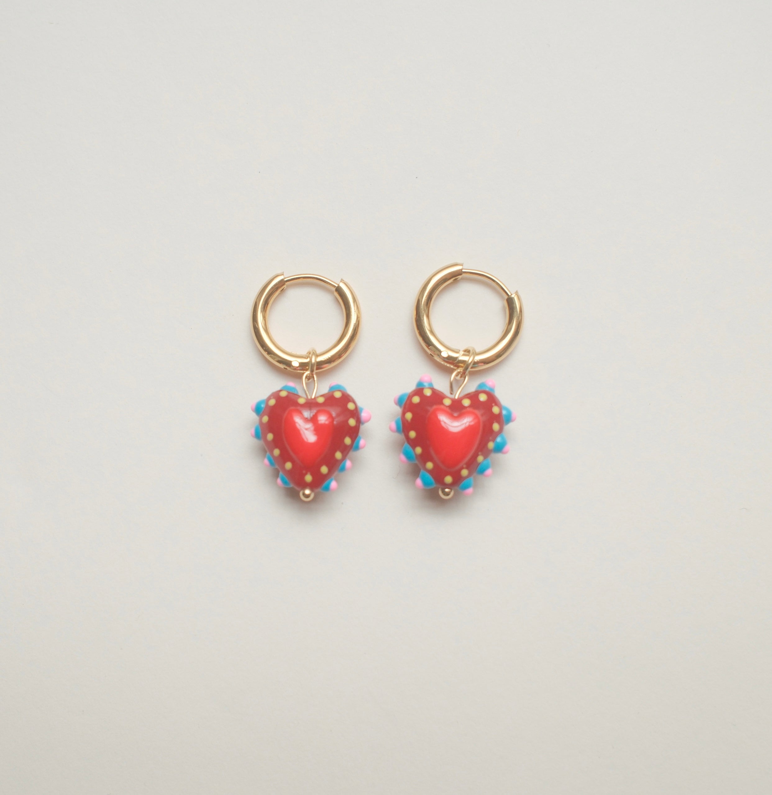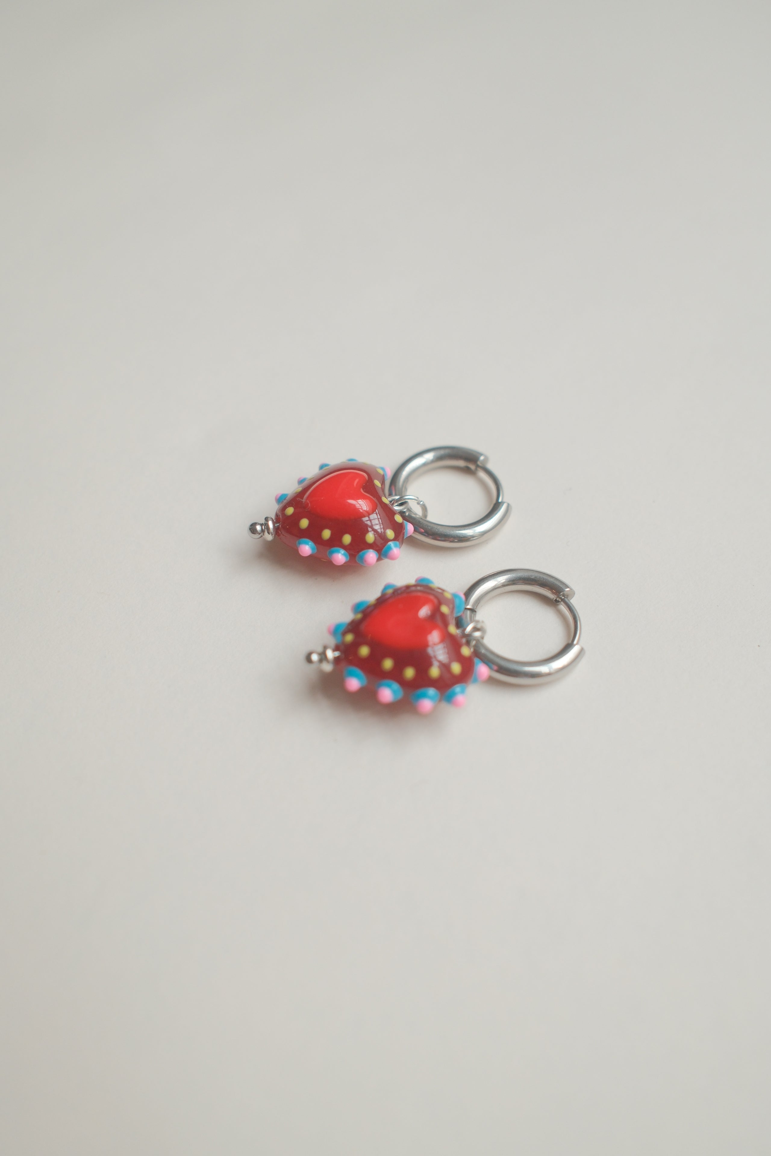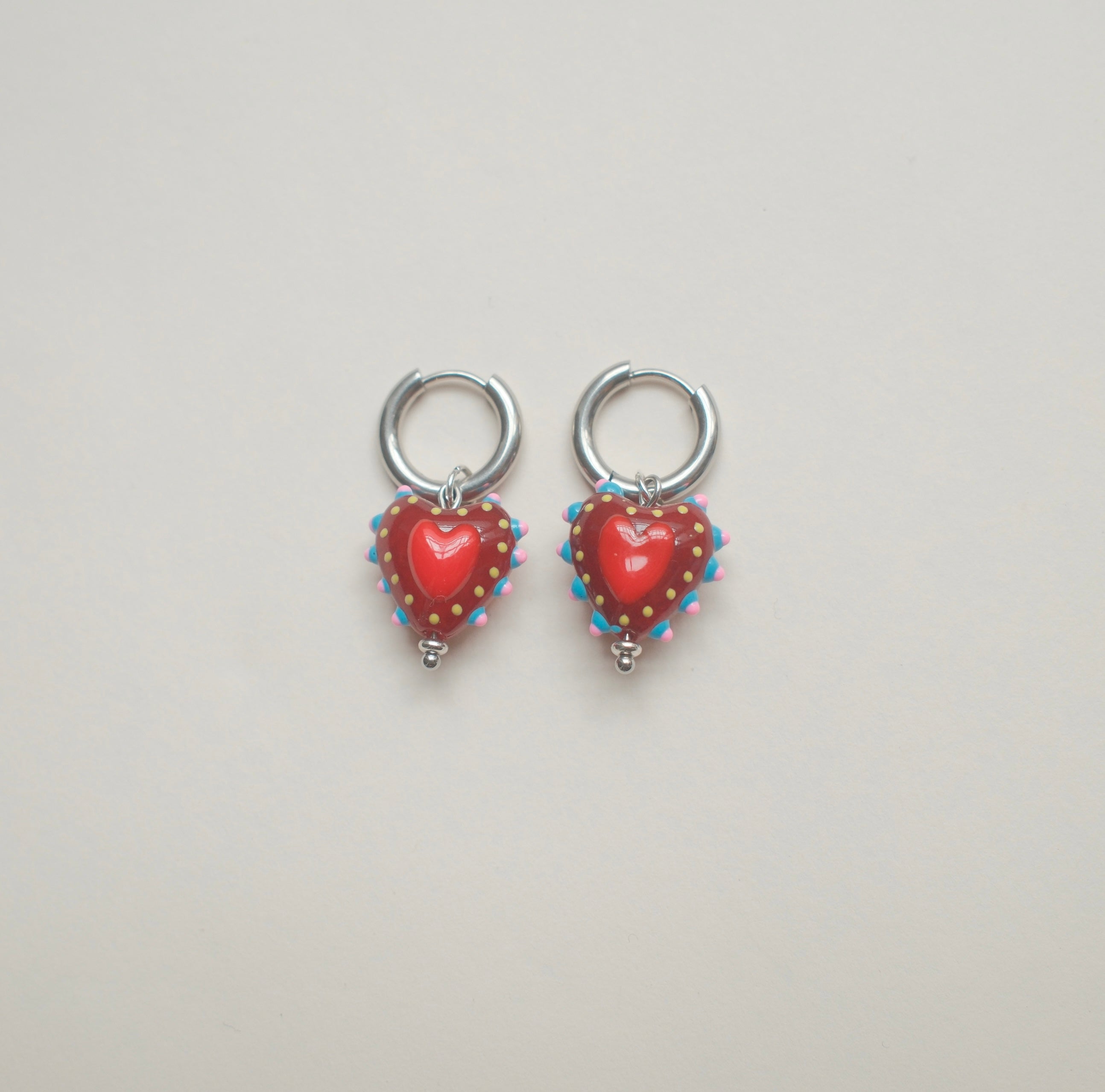 Handmade glass heart beads in vibrant maroon and red, finished with blue and pink spots. Attached to stainless steel hoops, these earrings bring a playful pop of colour to any outfit. Please note, each pair may vary slightly due to the handmade nature of the materials. Approx. 3cm in length.