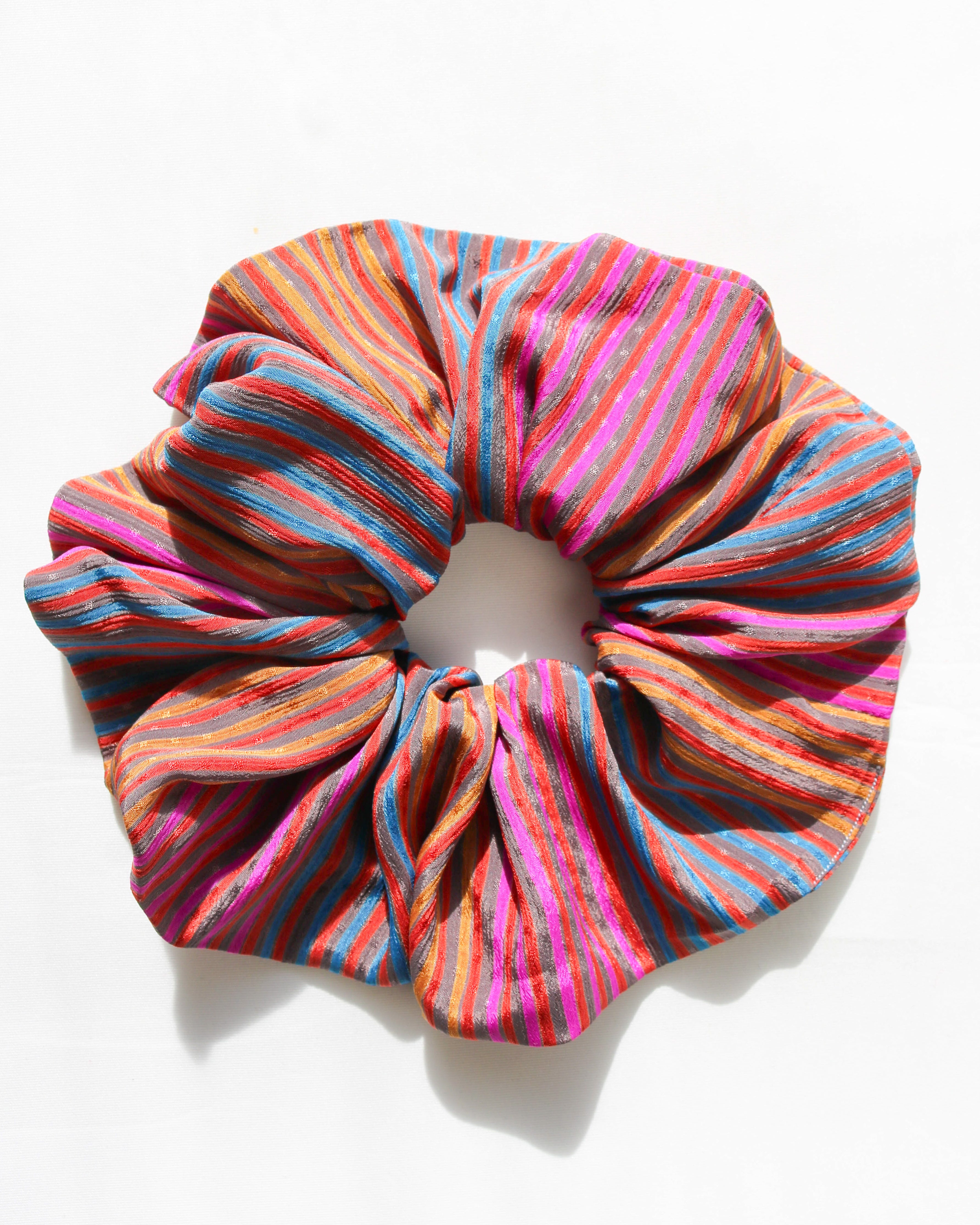 The classic hair accessory in a printed fabric, showing textured, intricate multicoloured stripes. It feels light and comfortable when worn, with strong elastic for durability.