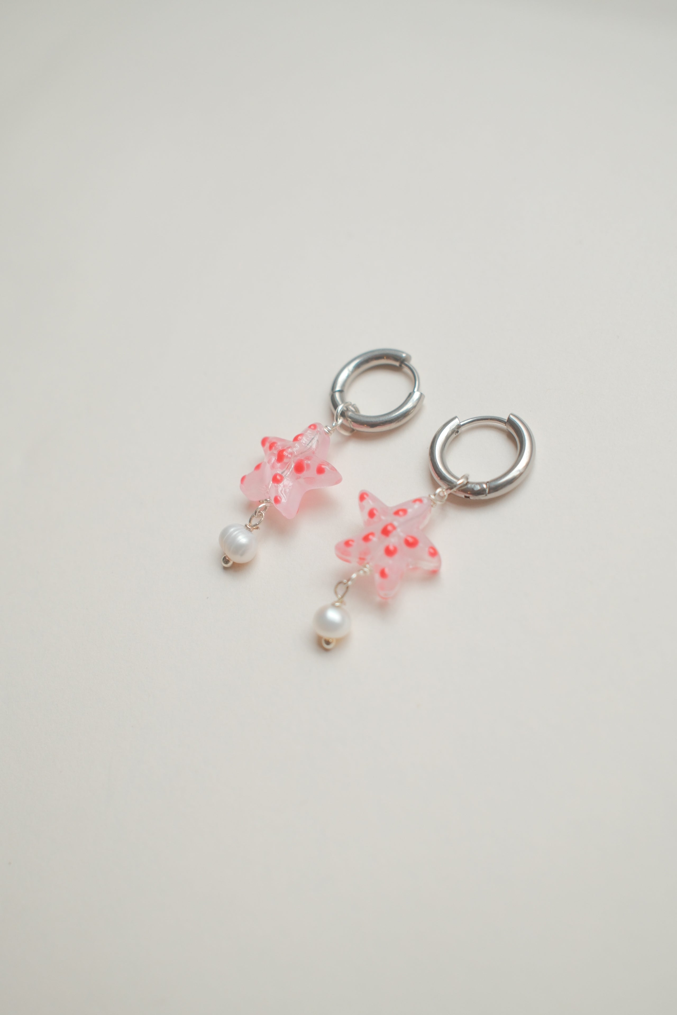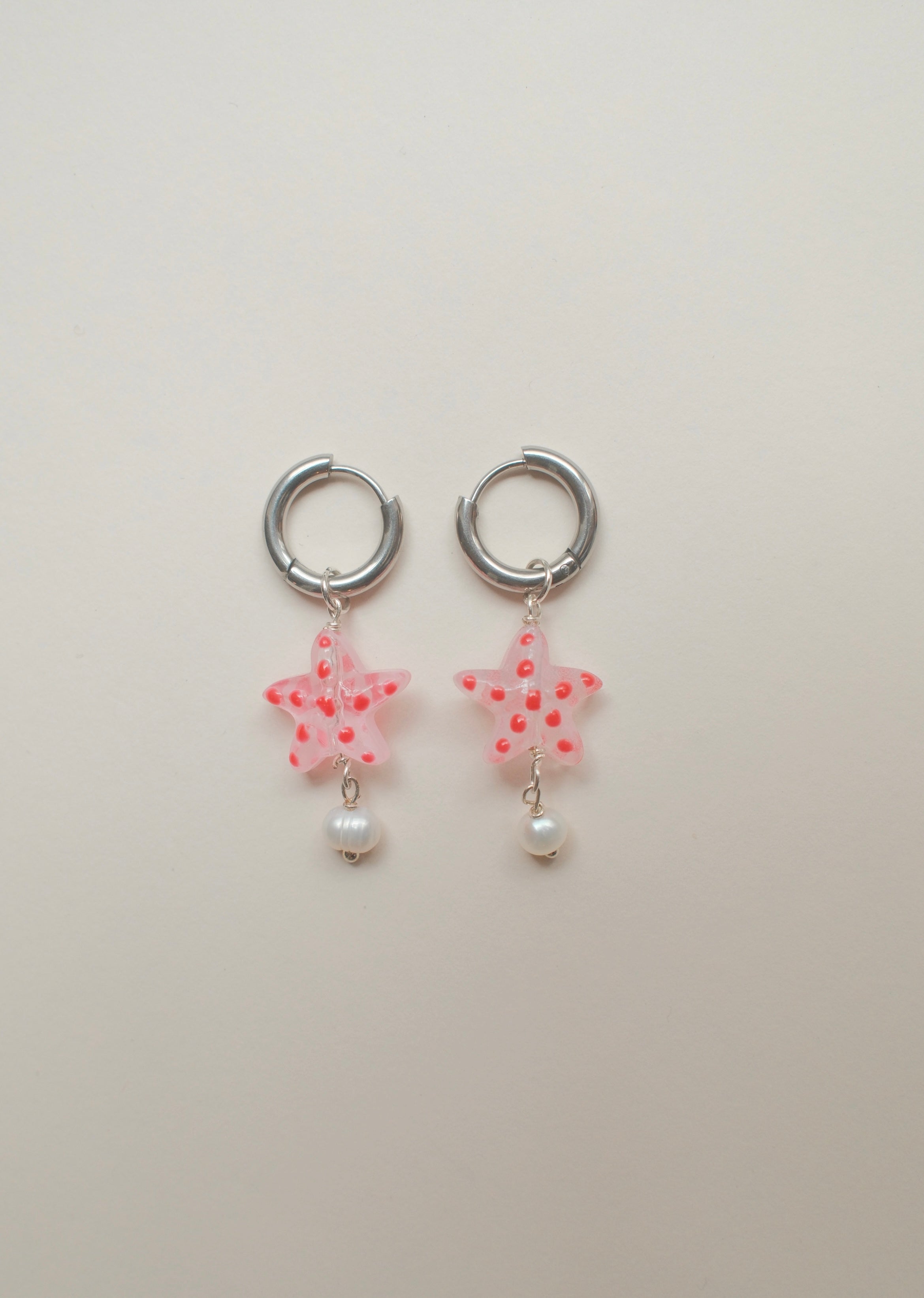Handmade delicate glass starfish beads in pink with red spots and dangle freshwater pearls. Dangling from stainless steel hoops, these earrings are perfect for everyday wear or holiday evenings. Please note, each pair may vary slightly due to the handmade and natural materials. Approx. 4cm in length.