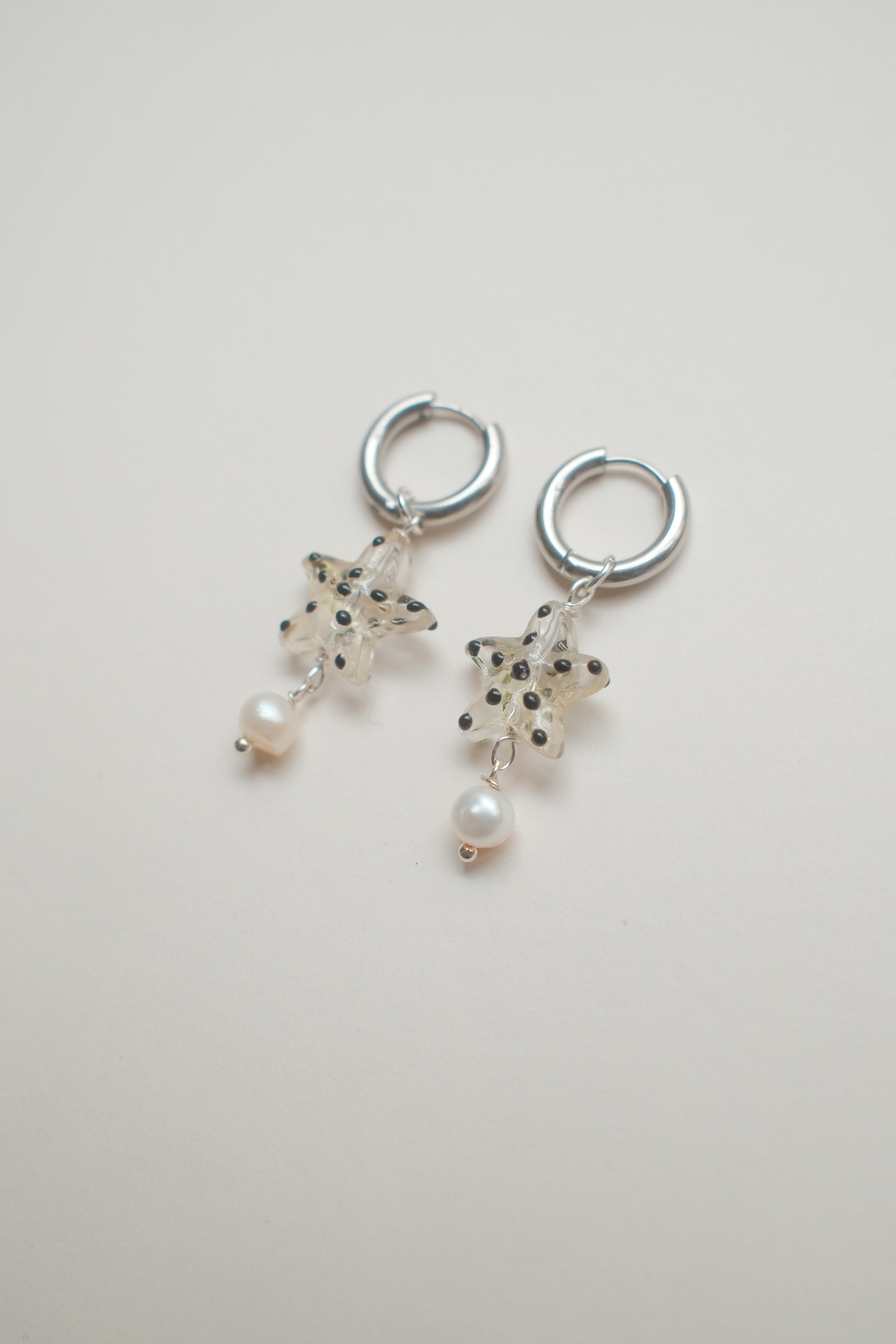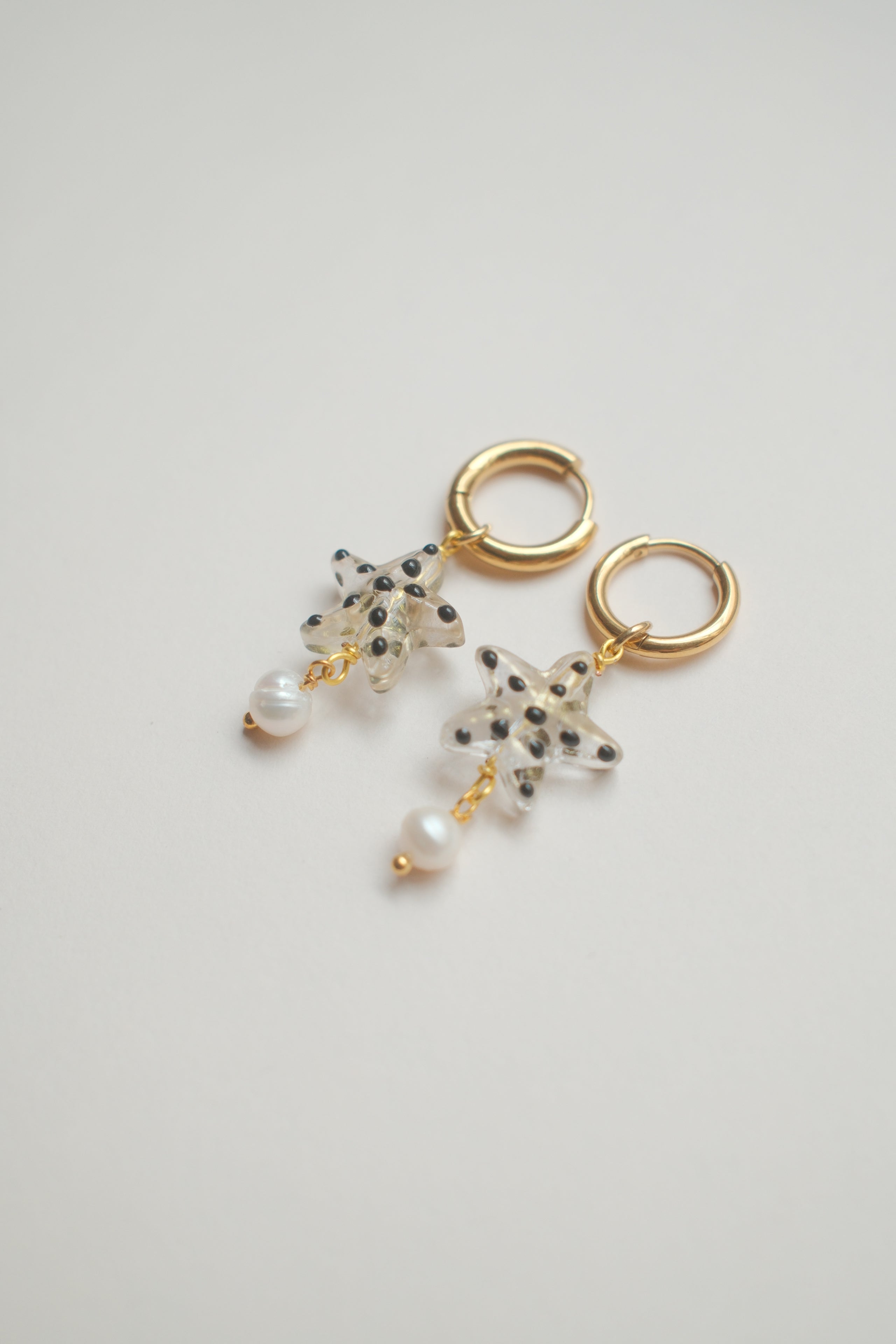 Handmade clear delicate glass starfish beads with black spots and dangle freshwater pearls. Dangling from stainless steel hoops, these earrings are perfect for everyday wear or holiday evenings. Please note, each pair may vary slightly due to the handmade and natural materials. Approx. 4cm in length.